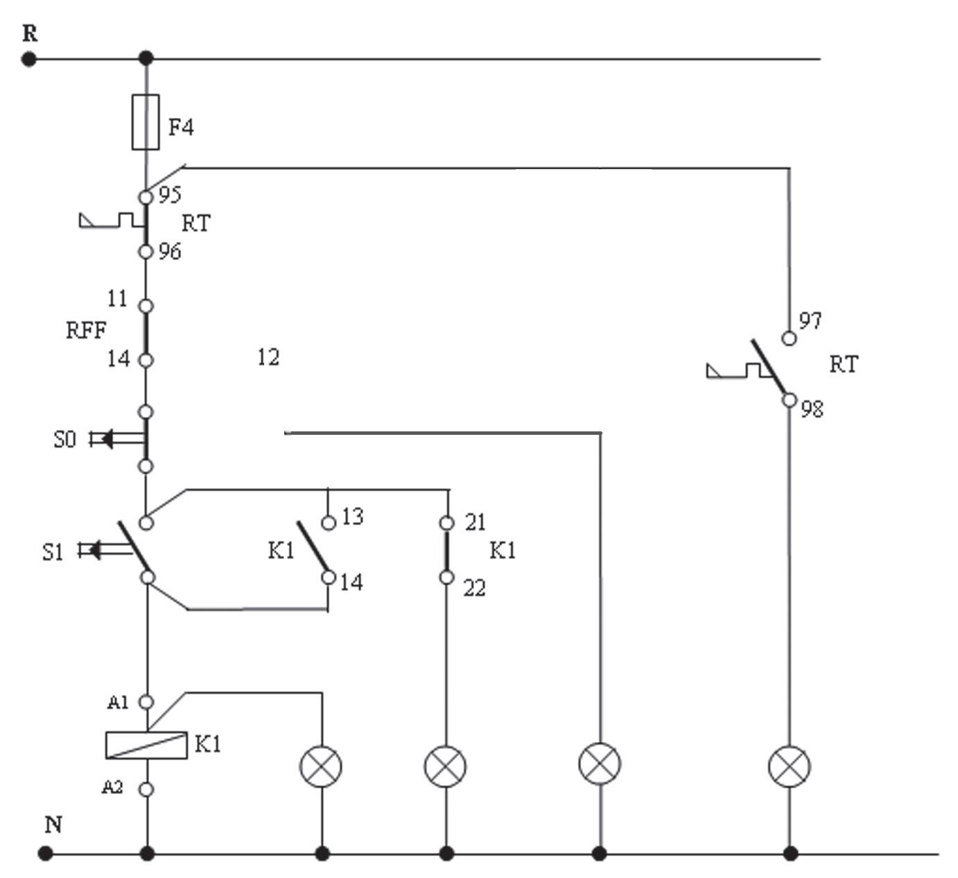 Curso de Capacitación 32 Capítulo IX MUNDO DE LA ELECTRICIDAD 28 años R F4 95 RT 96 11 14 RFF 13 14 21 22 97 98 RT K1 K1 S0 S1 12 A1 A2 K1 N
