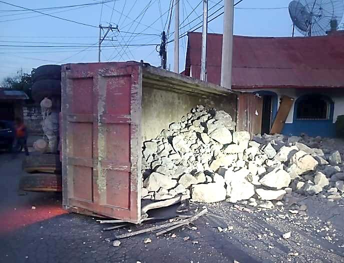 Mineral del Monte.- Por una falla mecánica, un camión materialista volcó en la intersección de Juárez y Francisco I. Madero.