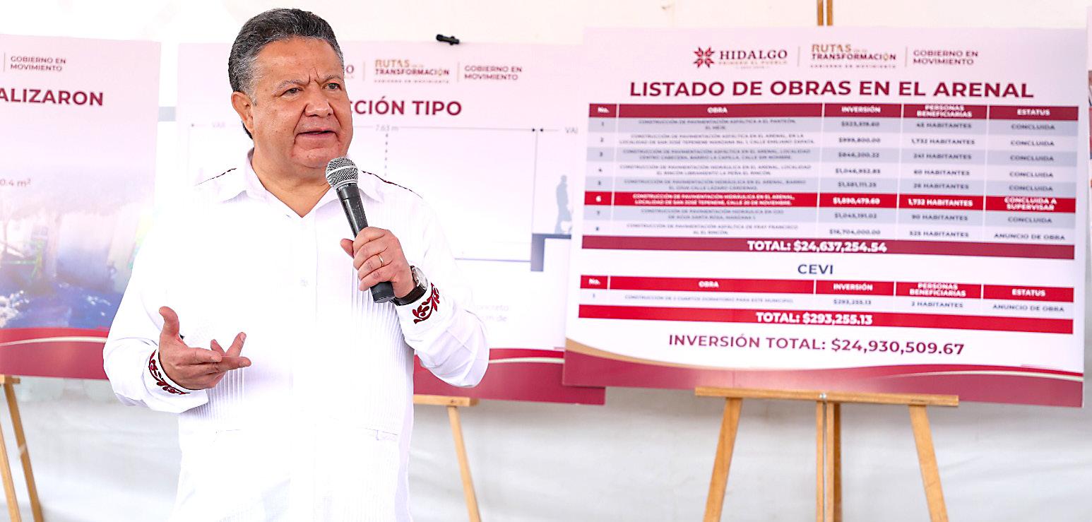 EL ARENAL, Hgo.- El gobernador de Hidalgo, Julio Menchaca Salazar realizó una supervisión de obra en la localidad de San José Tepenene, en el municipio de El Arenal, además de anunciar otros trabajos de infraestructura que beneficiarán a decenas de familias, gracias a una inversión que rebasa los 25 millones de pesos.