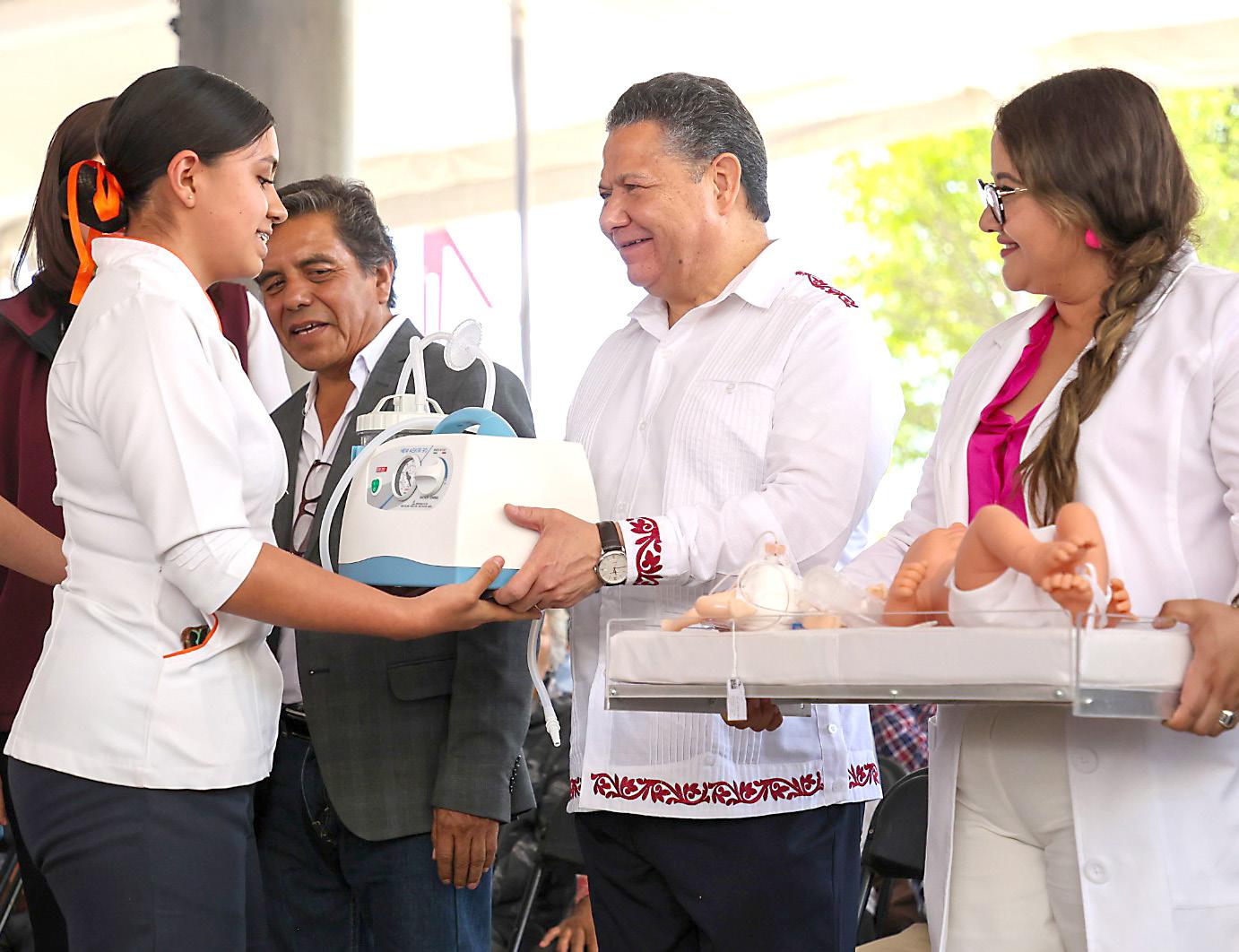 sos de inversión estatal. Luego de la presentación del programa “Música para el Pueblo”, a cargo de los integrantes del taller de un coro infantil, Menchaca Salazar realizó la entrega simbólica de equipamiento para el Taller de Enfermería del Colegio de Estudios Científicos y Tecnológicos del Estado de Hidalgo, Plantel Poxindeje, mismo que requirió de un gasto programado de 371 mil 741 pesos en beneficio de más de mil estudiantes.