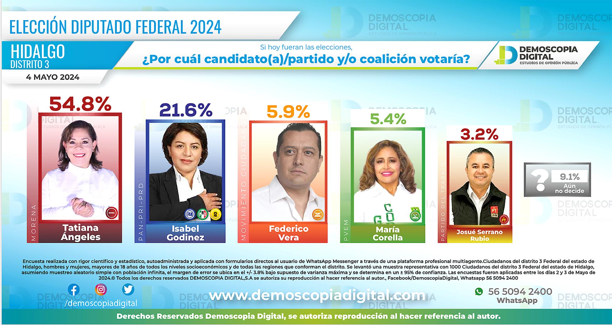 En cuanto a diputados federales la ventaja la llevan Daniel Andrade con 55.2%, Ciria Salomón 63.2%, Tatiana Ángeles 54.8%, Alma de la Vega 37.6%, Viridiana Cornejo 52.6% Ricardo Crespo 51.2% y Mirna Rubio 55.2%, en los distritos de 1 Huejutla, 2 Ixmiquilpan; 3 Actopan; 4 Tulancingo, 5 Tula, 6 Pachuca y 7 Tepeapulco.