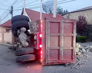 Mineral del Monte.- Por una falla mecánica, un camión materialista volcó en la intersección de Juárez y Francisco I. Madero.