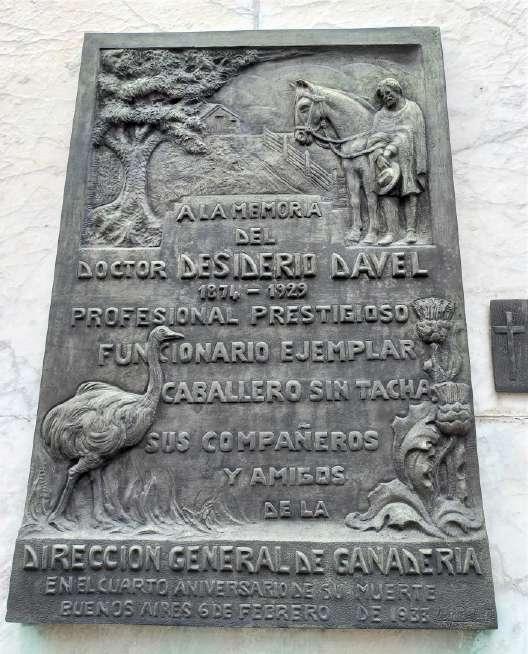 SibienelÑANDÚnoaparecerá en ningún bestiario medieval ni forma parte del repertorio de relatos mitológicos,formapartedelasimbología que enriquece el lenguaje del patrimonio del Cementerio. Junto al único DOLIENTE GAUCHO que formapartedeunaplacaconmemorativa, despojado de todo el ropaje a la moda griega que solemos ver en normalmente en otras placas y que con audacia aparece con ropas tradicionales del campo argentino Comparte con su caballo y amigos con la cabeza inclinada ese sentimiento de respeto, duelo y tristeza. En el fondo vemosunpaisajenetamenteruralconárbolesycercados. Debajo observamos por primera vez en este espacio la presenciadeunÑANDÚqueenriquecenuestrobestiario. Igualmente en el lado derecho se observa claramente la plantayflordelcardo.