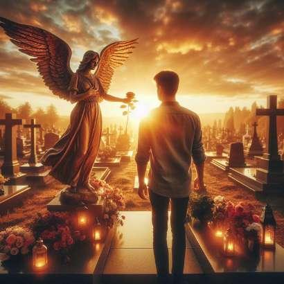 Mequedéobservandolapuestadesolmientras mimentedivagabaentreelmisteriodelamuerteylo maravilloso de la vida. Fue entonces cuando observé larosaenlamanodeunhermosoángelquehacíacompañíaaunatumbaquedecoradaconfarolesencendidosyhermosasflores,nuncahabíavistoantes. Memaravillóesaescenaysobretodolahermosarosa queiluminadaporlosdoradosrayosdelsolsemeofrecía.