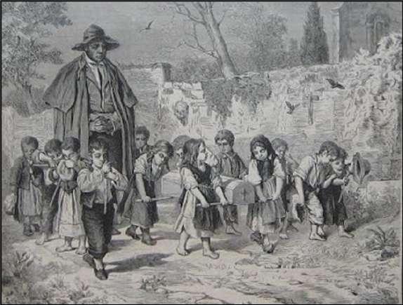 salpicadas en el horizonte que se hunden en la semipenumbra del crepúsculo. Por la sierra o tipo de monte bajo podría ser un paisaje típico de Andalucía o Aragón.Ungrupodeniñasllevanelangelitoseguidopor elsacerdote,elacólitoyelsacristán.Detrásdeungrupo de mujeres (posiblemente las plañideras o lloronas) de diferentes edades que recitan oraciones ataviadas de negroconmantillasyvestidosdefaldaslargas,lassigue unamadreconunniñoenbrazosescoltadaporunperroy finalmenteunhombreconbastóncerrandoelgrupo. Del mismo modo hemos hallado otros dos grabados que representan el cortejo del angelito hacia el Cementerio. Si bien no ilustran la problemática en el contexto de trabajo –ya que refieren a las comunidades Andaluzas y Gitanas-, como hemos mencionado en lo que respecta a Carraffa, las recurrencias con lo local son marcadamente significativas. Los dos grabados se encuentran expuestos en “Costumbres populares Andaluzas: La Muerte” de Montoto. Se resalta que “Enlacomunidadgitana,elvelatoriodeunniñoiba acompañadodeamigosyfamiliaresquecantabany bailaban,segúnerasucostumbre.Sehacíaasíensus tradicionesporqueloentendíancomolacelebración delregresoalcielodelalmadeunángel”