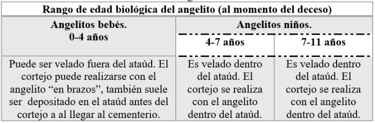 Retomando la tipología de angelito que proponemospodemosesquematizarlasmodalidades del traslado del cuerpo en el cortejo atendiendo al rangodeedadbiológicadelangelito: