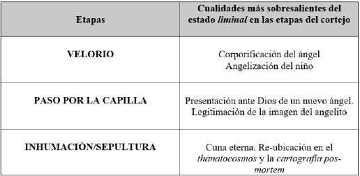 Inferimos, si bien este recorrido constituye un proceso,quelasetapasdondela liminalidad delniño setornamásefervescentesonelVelorio,elpasopor la Capilla y la Inhumación/Sepultura. No es casual que estas etapas sean acompañadas por oraciones, cánticos y versos que coadyuvan a la angelización del niño y a la humanización de la figura angélica. Insistimosenelusodelosesquemaspararepresentar estosaspectos