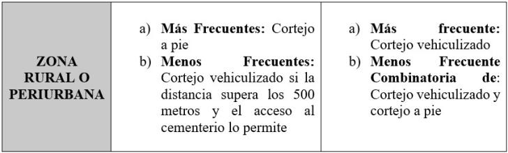 En las zonas rurales, y también en la periurbanas, se suele observar una combinatoria entreelcortejovehiculizadoyelcortejoapiecuando setratadeinhumacionesenlosenterratoriosalavera de las rutas, Estancias forestales o ganaderas. Se realiza el traslado hasta donde la condición del caminohabilitadolopermite,luegosecontinúacon elféretroenmano.Laideade“lovehiculizado”debe entenderse como aquellos traslados realizados por cochesdecasasfunerarias,automóvilesdelafamilia delosdolientesovecinos,camionetas,camionesde mayorportequetrasladanalosasistentesalvelorio, vehículos de los gobiernos municipales o contratados a terceros (empresas de taxis o remisses);nohemosobservado-niregistradoenlas entrevistas-casosdelpresenteetnográficodondelos traslados se hayan efectuado en carros o carretas comolodescribenalgunasnarracionesfolklóricas.