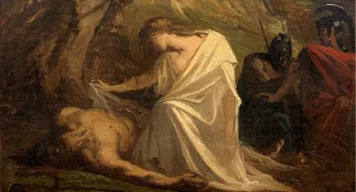 Antígona vela el cuerpo de su hermano Polinices en un óleo del pintor francés Jean-Joseph Benjamin-Constant (1868)