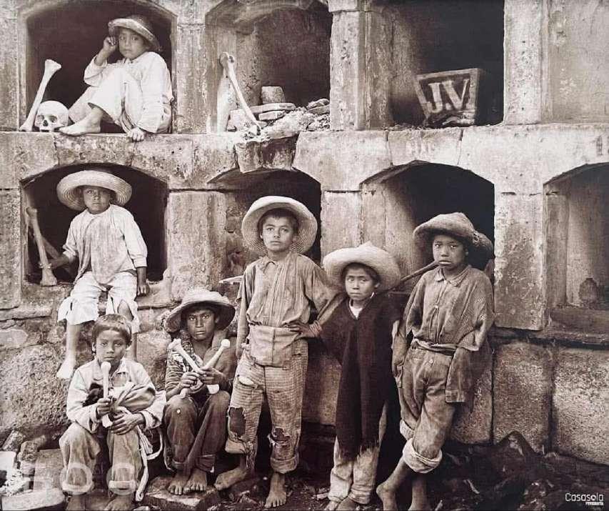 Entre las joyas del Archivo Casasola se encuentra esta impactante fotografía: un grupo de niños jugando entre nichos abiertos, sosteniendo fémuresyotrosrestosóseos como si fueran simples juguetes.