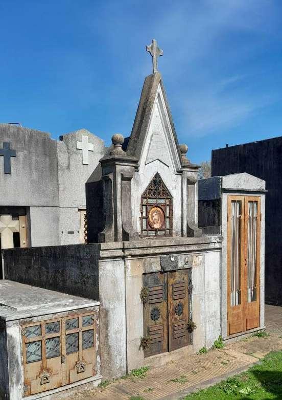 Estepequeñomausoleo,delíneasneogóticas,sealzadiscretoperosolemneentrelasgalerías del Cementerio Viejo de Libertad. Su fachada puntiaguda, coronada por una cruz y flanqueada por pináculos con esferas, refleja la influencia góticatancomúnenelartefunerariodeprincipios y mediados del siglo XX en Argentina. El vitral superior, con la imagen de Cristo coronado de espinas,añadeunairedevocionalquedialogacon el deterioro noble del hierro y la piedra. Las puertasoxidadas,adornadasconfloresmetálicas, cuentanelpasodeltiempoylasestaciones,mientras la placa de bronce con un angelito custodio introduceeldramaíntimoqueguardaesterecinto.