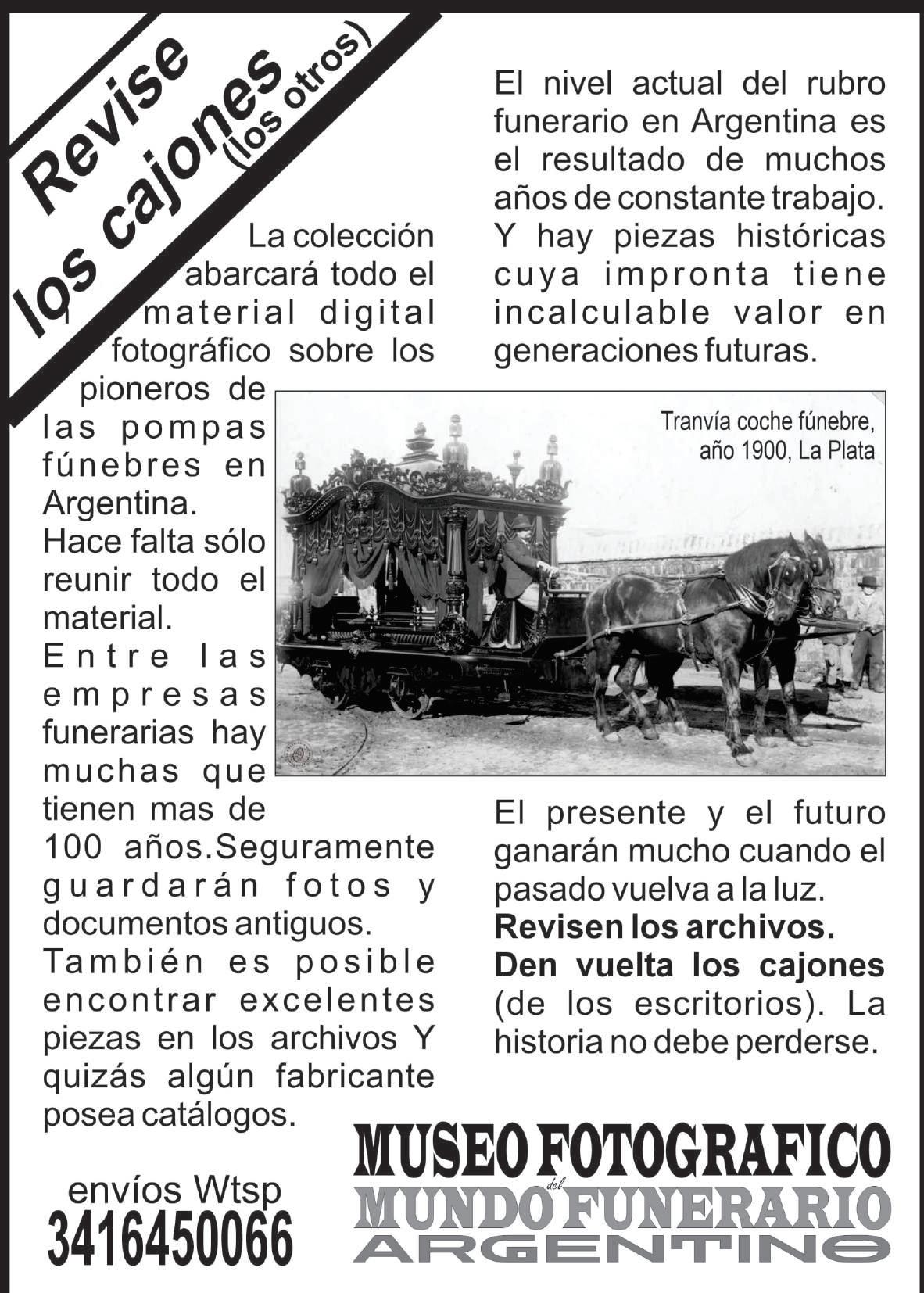 Seguimos creciendo, en calidad, en contenido, en difusión, en anunciantes,enlectores,entodolodeseable;Gracias,graciasatodoslosque hacenposibleestamagnificarealidadqueestamosviviendo. Entre las propuestas que nos llegan nos hemos embarcado en el MUSEO FOTOGÁFICO. Valorar el Pasado es una forma de proyectar el Futuro,viviendoelpresente.Lasnuevasgeneracionestienenquesaberque llegamoshastaaquíporelesfuerzoytesónquepusieronlosqueestuvieron antes,conerroresyaciertos.Hoyunacocheríaesexitosaporloquehicieron los fundadores y sus descendientes ya que en gran medida son empresas familiares.Enestacolecciónqueremosreflejarlarealidadfunerariaentoda sudimensióndesdeunacocheríafundadahace10añosenunpueblitohasta empresas centenariasdegrandesciudades.Todoelmaterialserácatalogado musegráficamente.