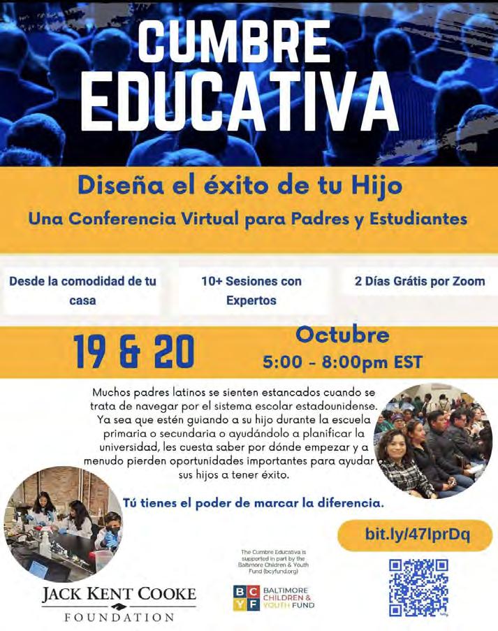 La cumbre se llevará a cabo de forma virtual el sábado 19 de octubre para estudiantes en Inglés y el domingo 20 de octubre para padres en Español, de 5:00 p.m. a 8:00 p.m. (EST), 4:00 p.m. a 7:00 p.m. (CST) y de 3:00 p.m. a 6:00 p.m. (PST) a través de Zoom. El evento del sábado se realizará en inglés para estudiantes y la sesión del domingo será en español para padres.