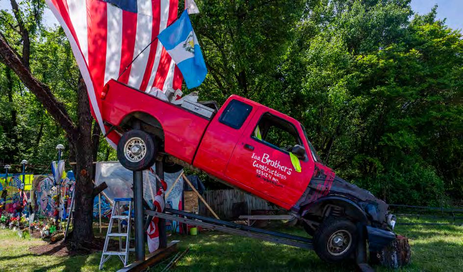 Monumentos conmemorativos para las víctimas del Puente Key incluyen a esta obra por Roberto Marquez de un camión con chalecos de construcción dentro.