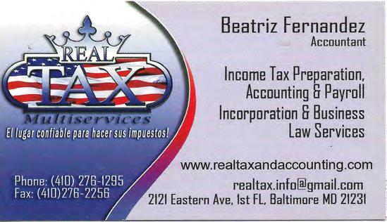 7 www.MLnewspaper.com LOCAL Tags & Stickers in Minutes (410) 687-1948 (410) 812-4812 Call Us / Llámanos Open Mon-Fri: 9 AM - 6 PM Sat: 9 AM - 3 PM Public Notary / Translations Tax Preparation 3Hr Alcohol & Drug Program 4Hr Driver Improvement Program (DIP) New Tag Registrations Temporary Tags Sticker Renewal (1 or 2 years) Duplicate Titles / Registrations MVA Services Placas & Stickers en Minutos Notario Público Preparación de Impuestos Programa 3Hr Alcohol y Drogas Programa 4Hr de Mejoramiento (DIP) Intérprete Autorizado por el MVA Citas para MVA Carta de Verificación de Empleo Renta de Vehículo para Exámen Práctico Nuevos Registros de Placas Placas Temporales Renovación de sticker (1-2 años) Placas con Pasaporte Duplicado de Título/ Registración Traducciones Servicios del MVA Abierto Lun-Vier: 9 am - 6 pm Sab: 9 am - 3 pm 629 Eastern Blvd Essex, MD 21221 Sepa Ud COMO EVITAR LAS ESTAFAS DE TRABAJO EN FIESTAS NAVIDEÑAS