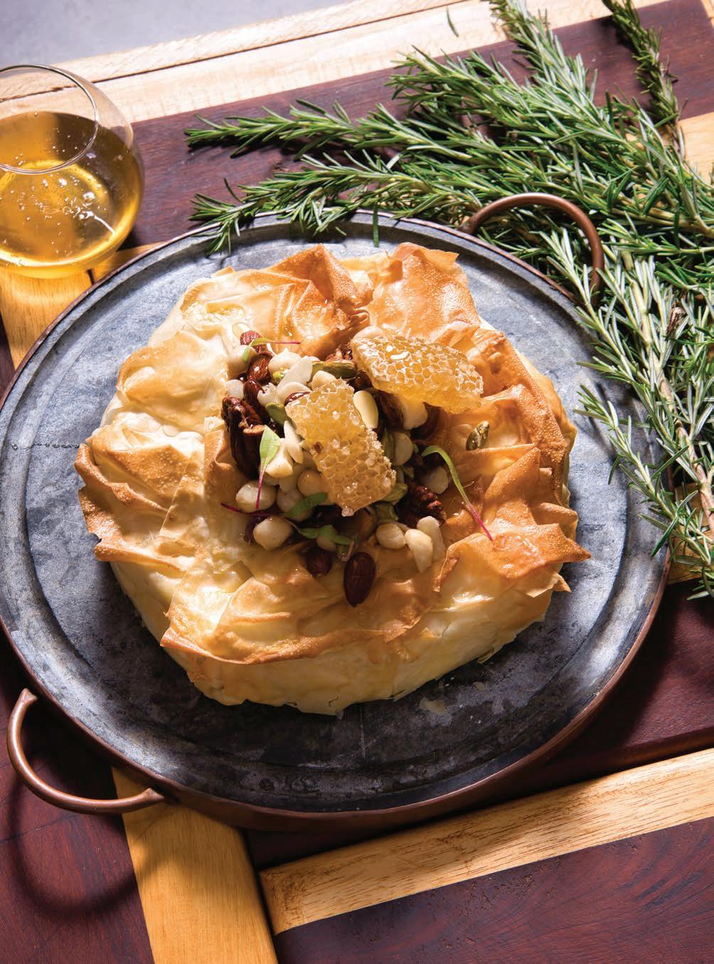 Brie folhado com castanhas e mel e, na página ao lado, Wellington de salmão na massa filo
