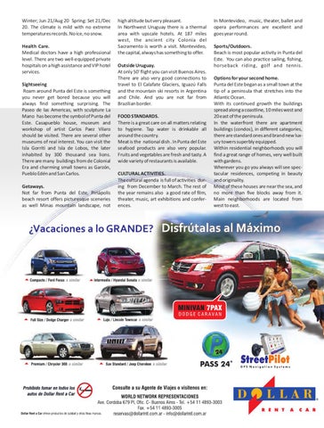 high altitude but very pleasant. In Northwest Uruguay there is a thermal area with upscale hotels. At 187 miles west, the ancient city Colonia del Sacramento is worth a visit. Montevideo, the capital, always has something to offer. Outside Uruguay. At only 50' flight you can visit Buenos Aires. There are also very good connections to travel to El Calafate Glaciers, Iguazú Falls and the mountain ski resorts in Argentina and Chile. And you are not far from Brazilian border. FOOD STANDARDS. There is a great care on all matters relating to hygiene. Tap water is drinkable all around the country. Meat is the national dish . In Punta del Este seafood products are also very popular. Fruits and vegetables are fresh and tasty. A wide variety of restaurants is available. CULTURAL ACTIVITIES. The cultural agenda is full of activities during from December to March. The rest of the year remains also a good rate of film, theater, music, art exhibitions and conferences.
