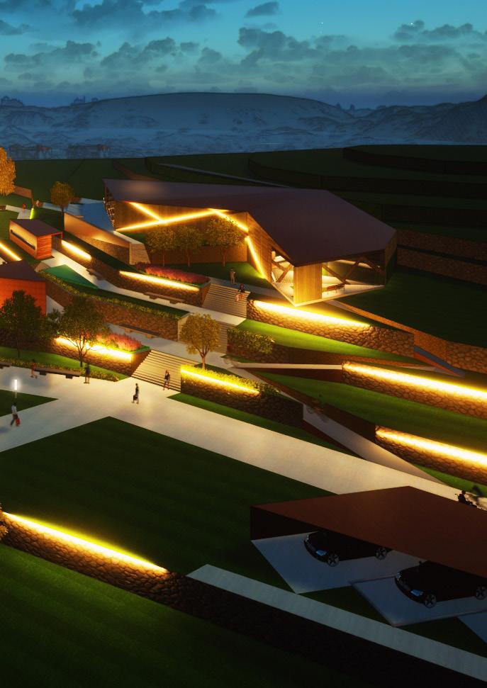 Siekiant suvaldyti šį reljefo nelyguma su sodo aukštais kurie padalina izohipsės į keturis lygius kuriais naviguojama laiptais, rampom.