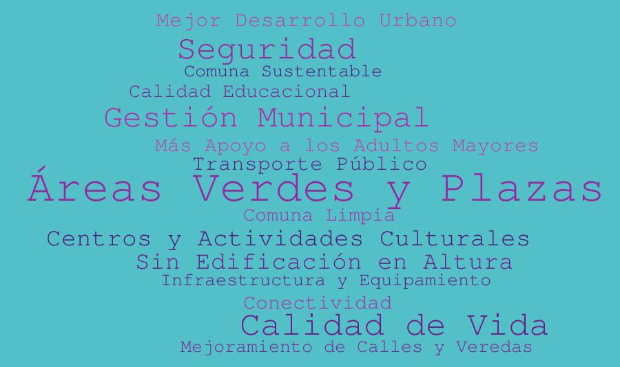 Resumiendo, se puede apreciar las imágenes deseadas para el futuro de la comuna agrupadas en 32 categorías distintas, representadas con color celeste en la tabla. Se puede observar que estas categorías se repitieron en un mayor número de talleres (celdas con diseños): i) Aumento y mantención de áreas verdes y plazas con 71 menciones; ii) Calidad de vida con 46 menciones; iii) Seguridad con 43 menciones; iv) Gestión Municipal con 42 menciones y v) Centros y actividades culturales y Sin edificación en altura ambas con 23 menciones.