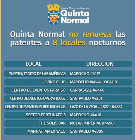 En el marco de la renovación de patentes de alcoholes se realizó una serie de fiscalizaciones por parte del equipo municipal -Departamento de Obras, Patentes Comerciales y Seguridad Públicajunto a Carabineros, dando cuenta que existían varias patentes de alcoholes de locales nocturnos incumpliendo la normativa. Se trata de denuncias de los vecinos respecto a ruidos molestos, peleas al interior de los recintos y situaciones que afectan la sana convivencia de la comunidad, así como temas relacionados a la falta de regularización o permiso de edificación de la propiedad, que les impedía funcionar en el lugar. Fue así que presentados los antecedentes en el Concejo Municipal se decidió no renovar -de forma unánime- las patentes de estos 8 locales y se notificó a las partes, quienes si bien presentaron sus alegatos, todos fueron rechazados.