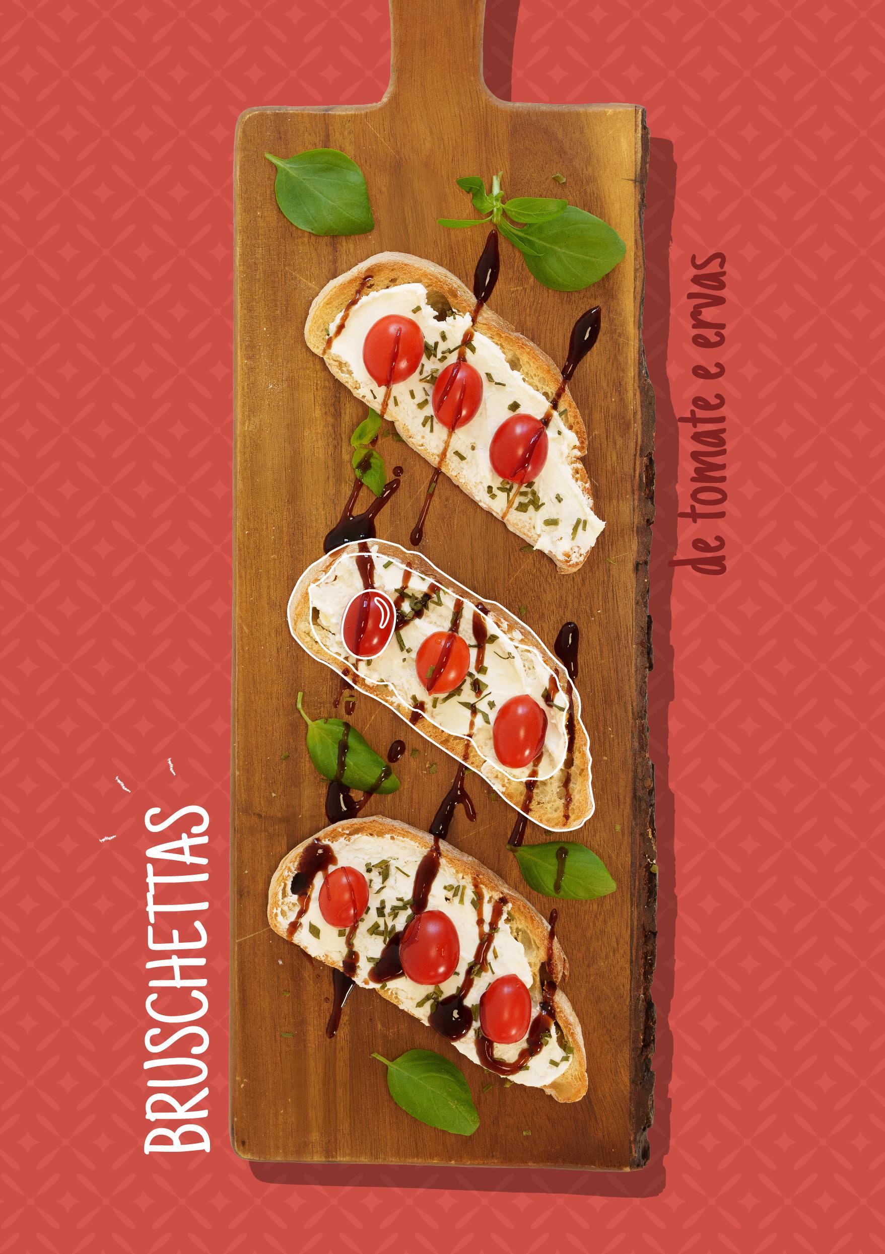 Barre com queijo creme cada fatia de pão aromatizada com alho. Depois, corte ao meio os tomates e disponha-os por cima do queijo.