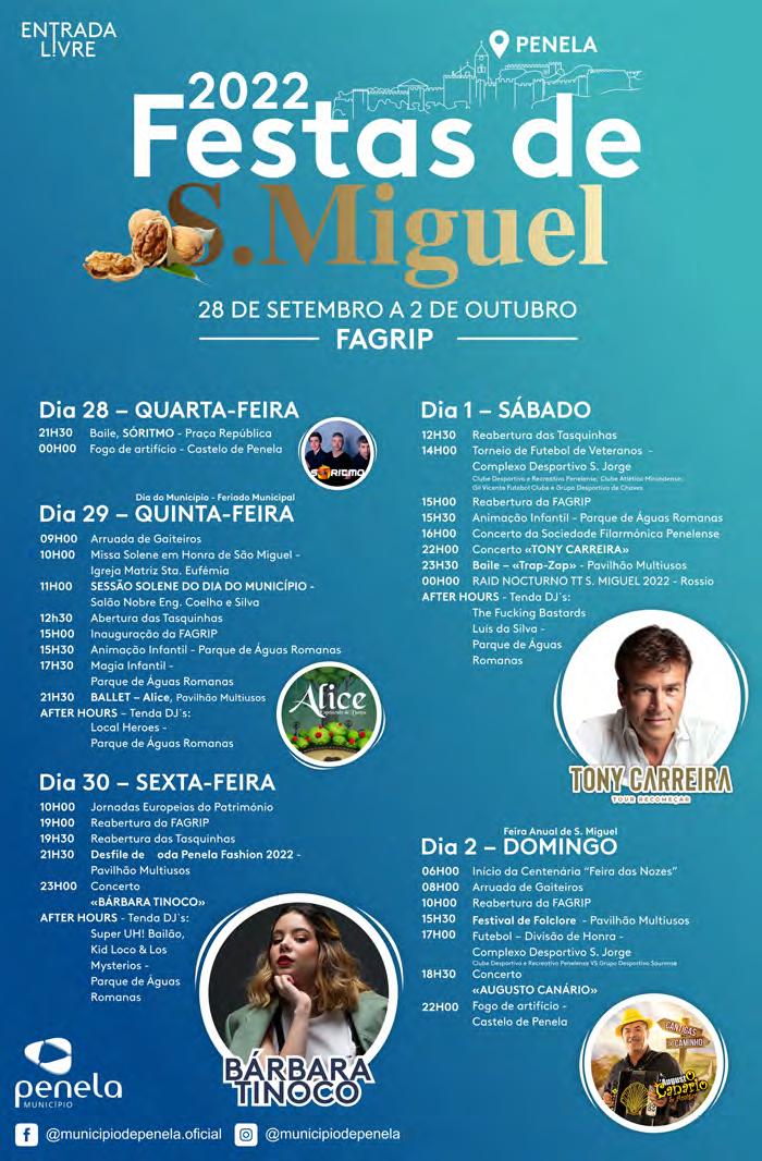 de artifício e muita animação para celebrar as tradições de Penela, que incluiu a Feira Anual de S. Miguel, a Feira das Nozes e a Feira Agrícola e Industrial de Penela (FAGRIP). As Festas de S. Miguel regressaram a Penela, depois de dois anos em que o formato foi adaptado às condicionantes da pandemia da Covid-19. A autarquia reforçou a aposta no certame, designadamente através de uma oferta
