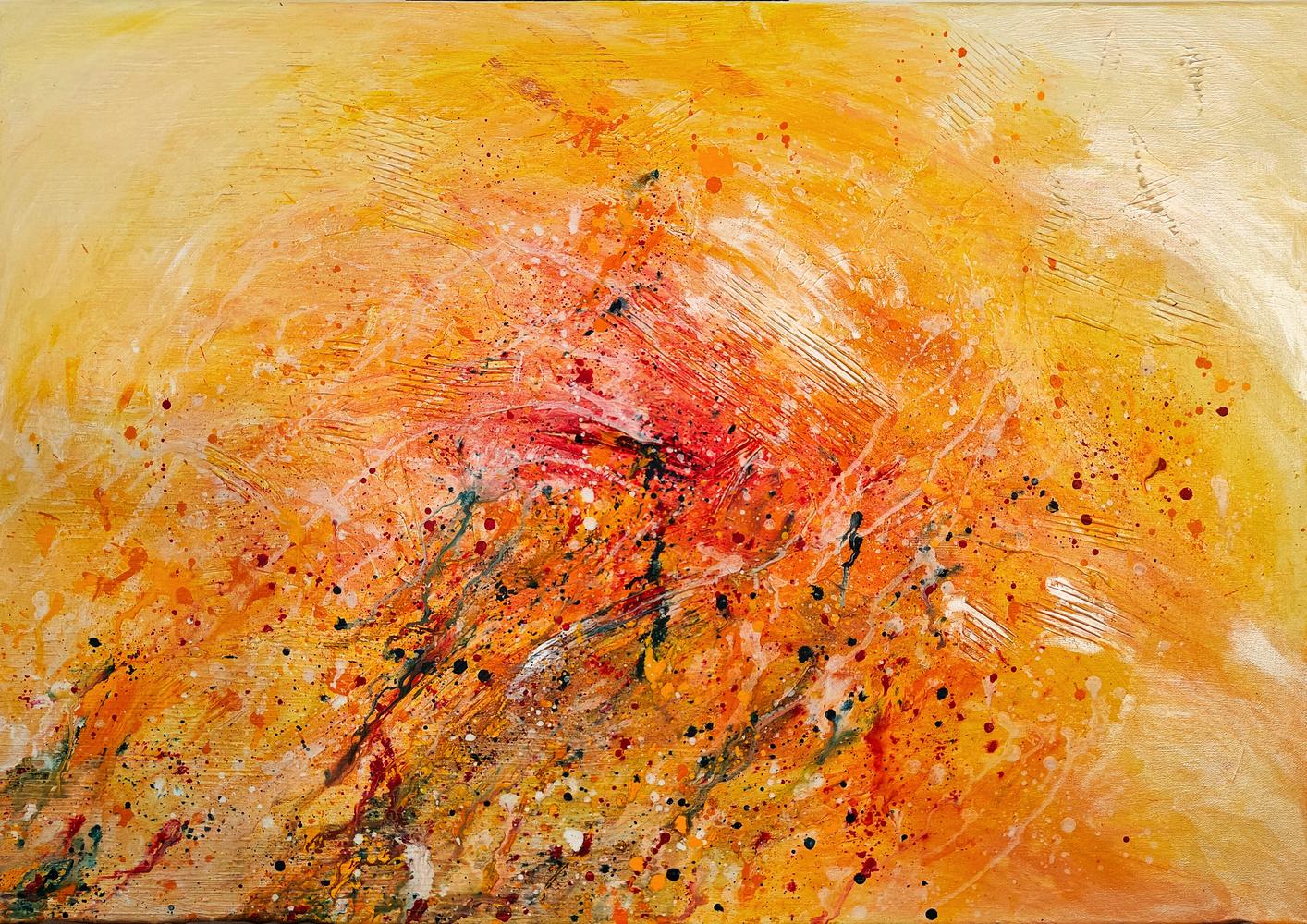 Controlled Chaos is a 50x70cm abstract piece that plays with the balance between order and disorder. Dominated by vibrant yellow, the artwork features a textured central surface with hints of red, creating a sense of depth and intensity. Pearly white streaks flow across the canvas, adding a subtle contrast and enhancing the dynamic energy of the composition The piece invites viewers to explore the tension between structure and spontaneity.
