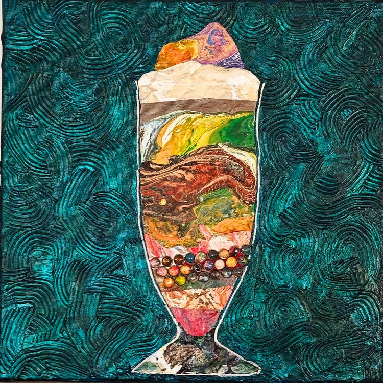 Reflection is a textured acrylic piece that explores the complexity of the human experience. At its center, a human figure stands, surrounded by a vibrant cascade of colorful art pouring in from the background. This striking contrast symbolizes the multifaceted nature of the self how personal identity and emotions are shaped by both internal and external forces. The textures and bold colors invite viewers to reflect on the intricate layers of human complexity.