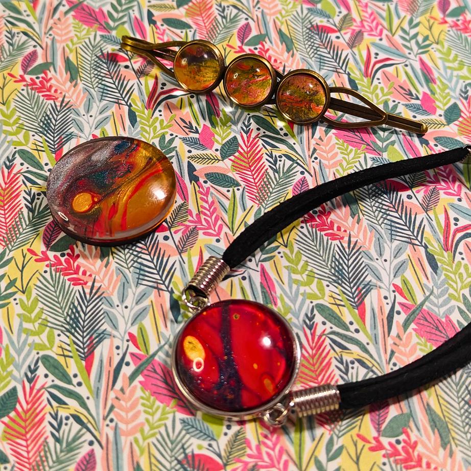 Each piece features textured art with a dynamic composition, incorporating a background made from origami paper. The design blends acrylic skins, metallic paint, and stud cabochon earrings, bringing vibrant life to these cultural symbols.
