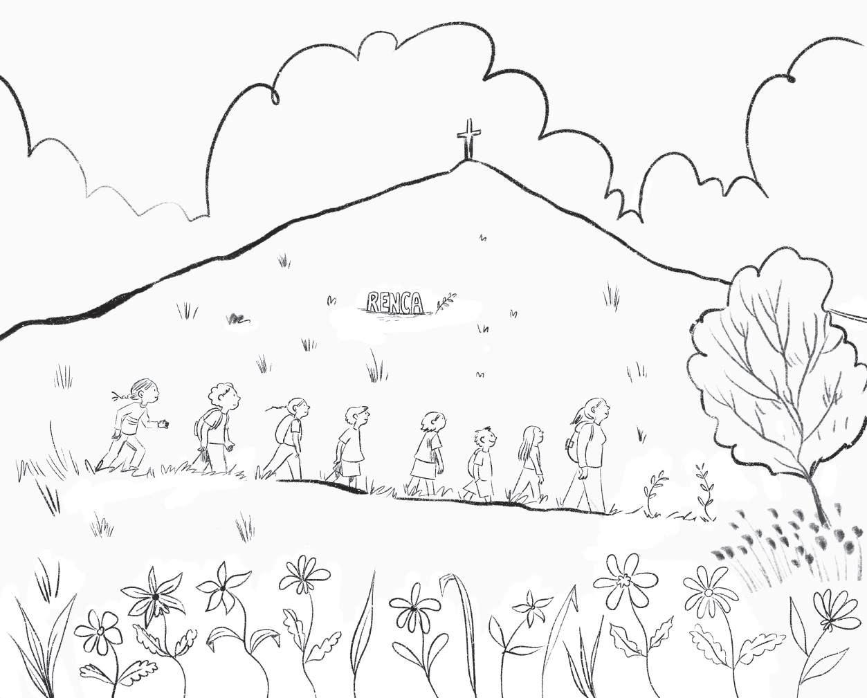 Debajo de las letras que dicen RENCA está la cueva de Don Emilio. Un día fuimos con mi mamá y mi papá y me contaron que Don Emilio fue un minero que trabajó en esa cueva buscando oro. También cuenta la leyenda que allí vivía el Cabeza de Chancho.