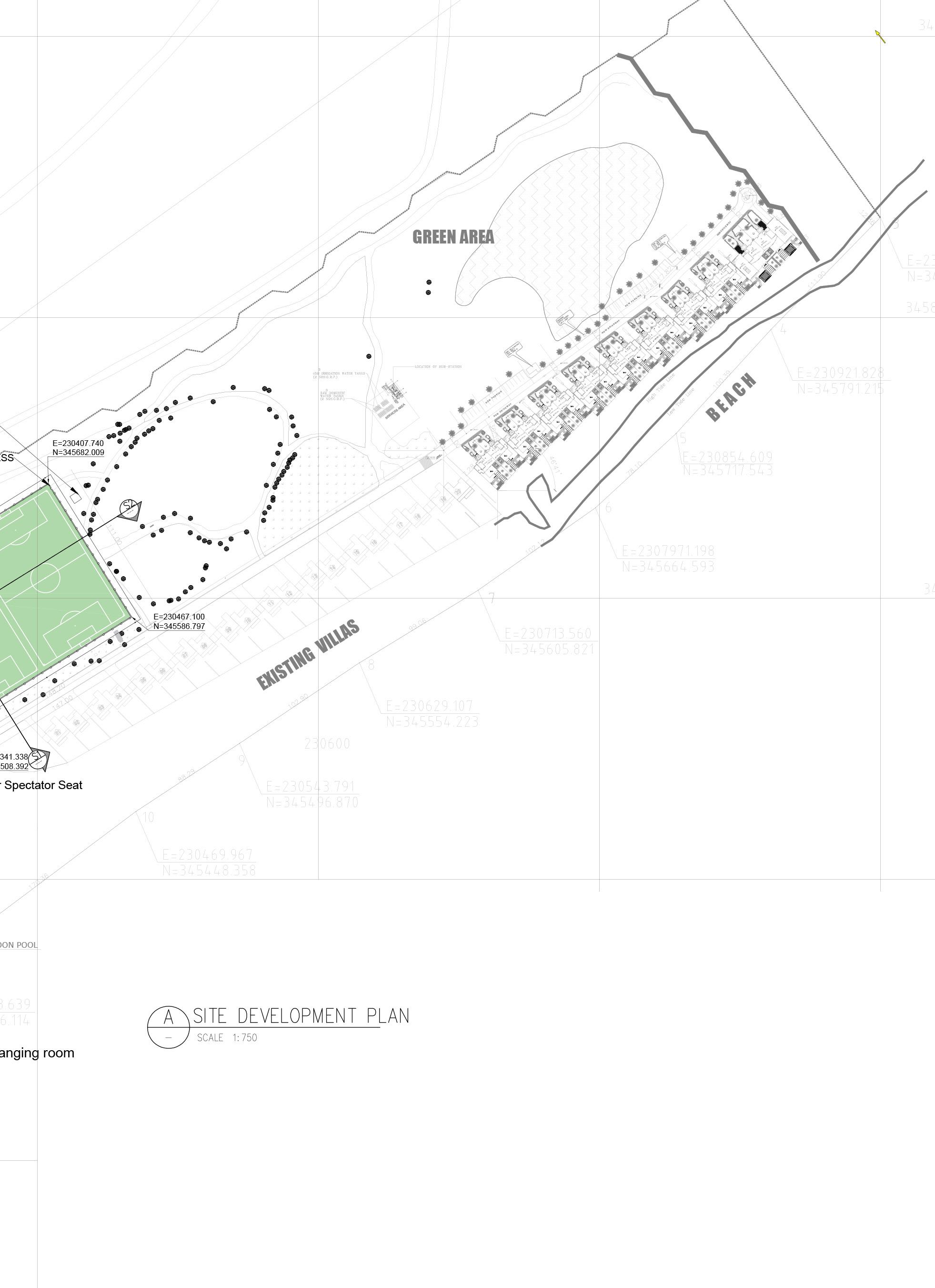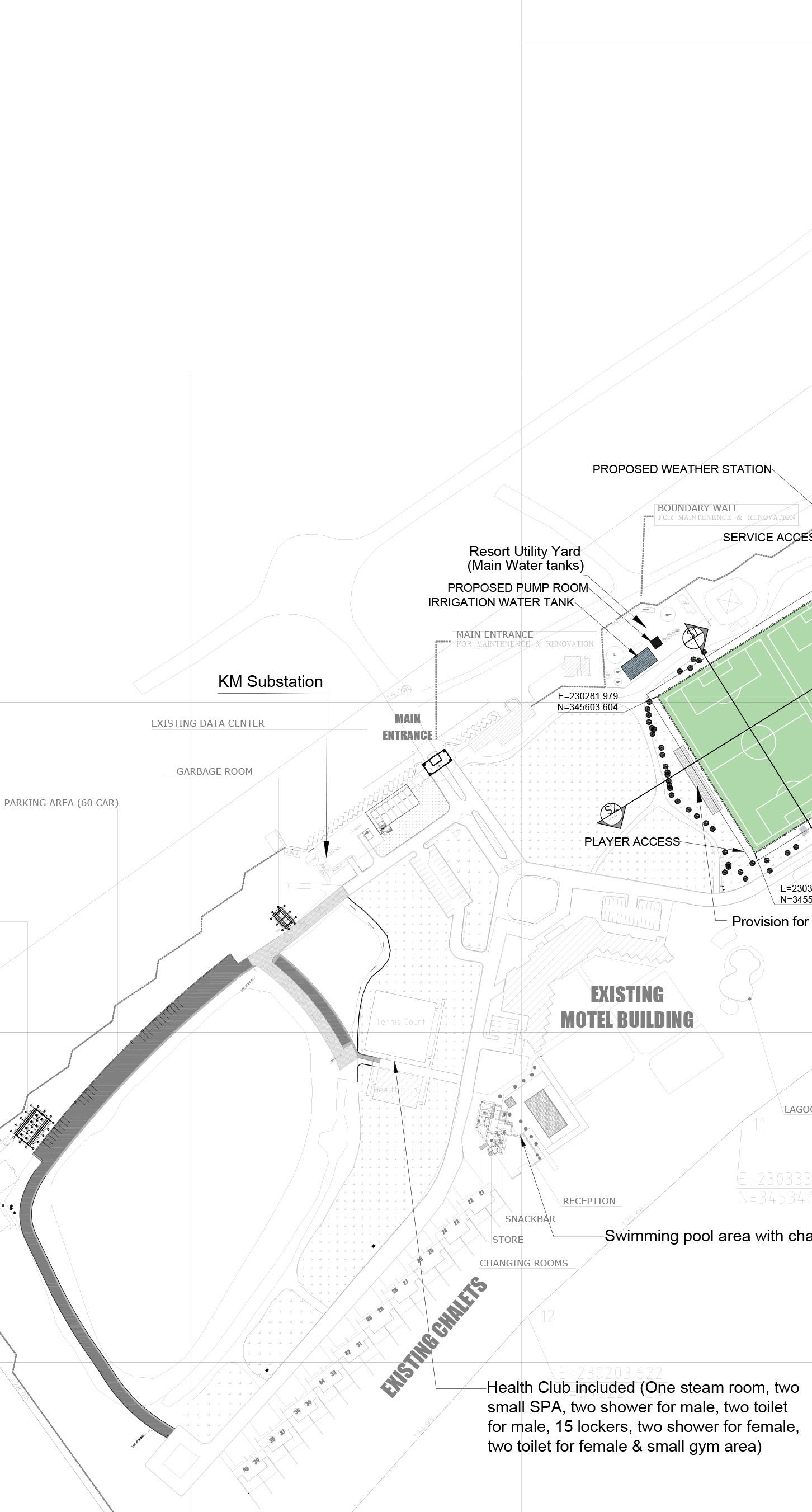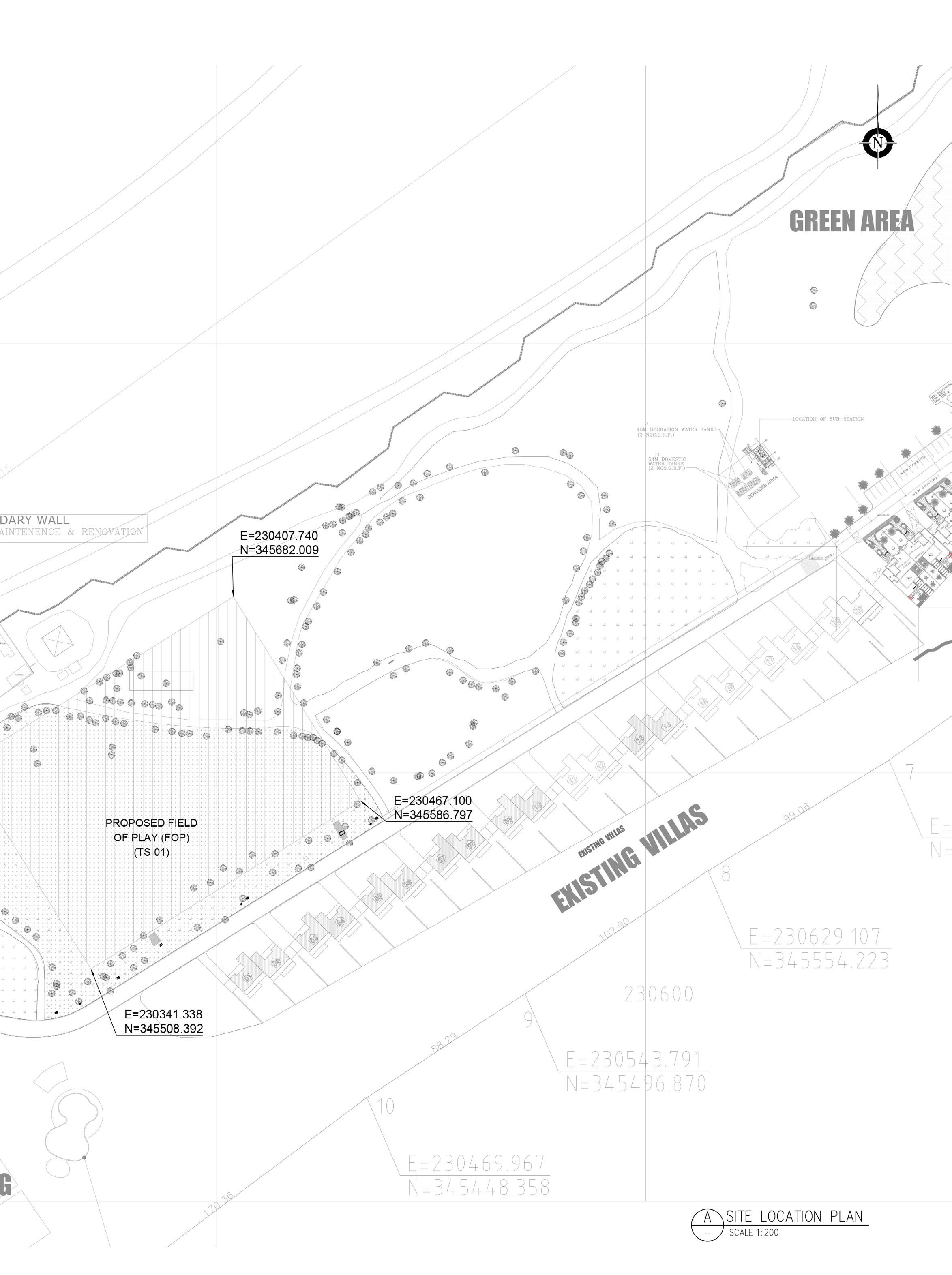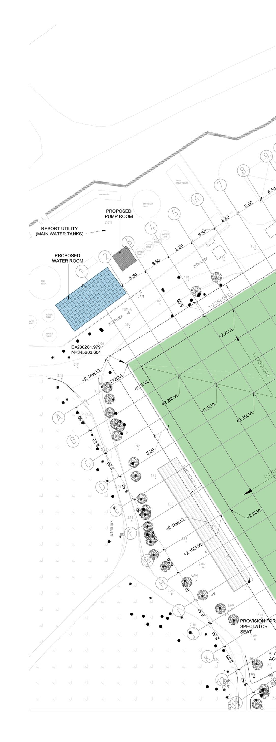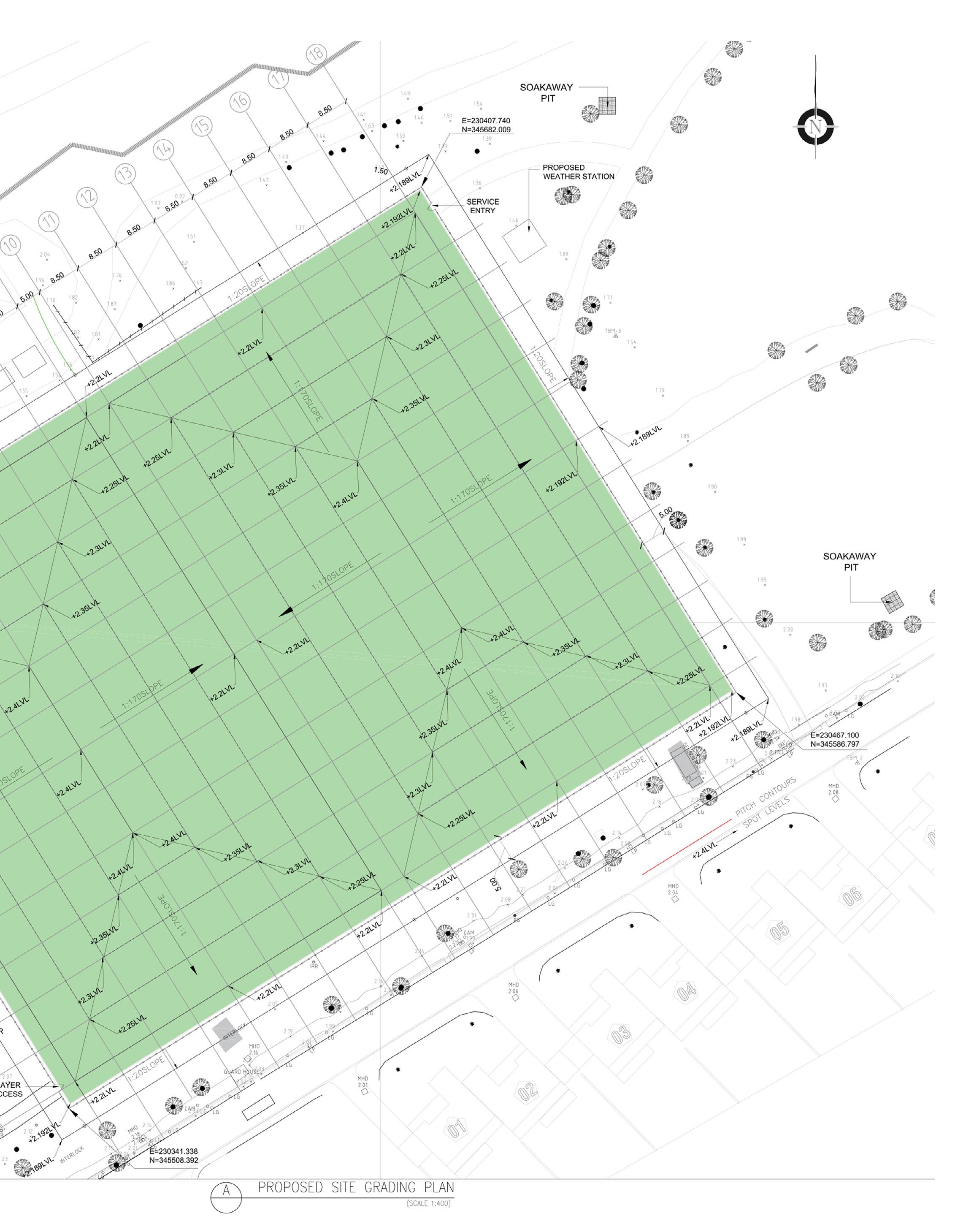 The pitch and allied utilities are proposed at the existing landscaped areas. 82 trees will be relocated as a part of levelling the site. As the site has contour, levelling and backfilling will be carried out to maintain the pitch at 100 mm from the path level. Pitch is levelled in a way that the highest point is at 2.4m at the centre and sloping -1:170 towards outer edges. Total area to be levelled is 16628.0400 sqm. From the centre a slope is provided -1:170 towards outer edge till the goal lines. Pitch fall will continue to a minimum of 1.5m path the Fop. The pitch fall outside the 1.5m perimeter the pitch should be no greater than 5%.