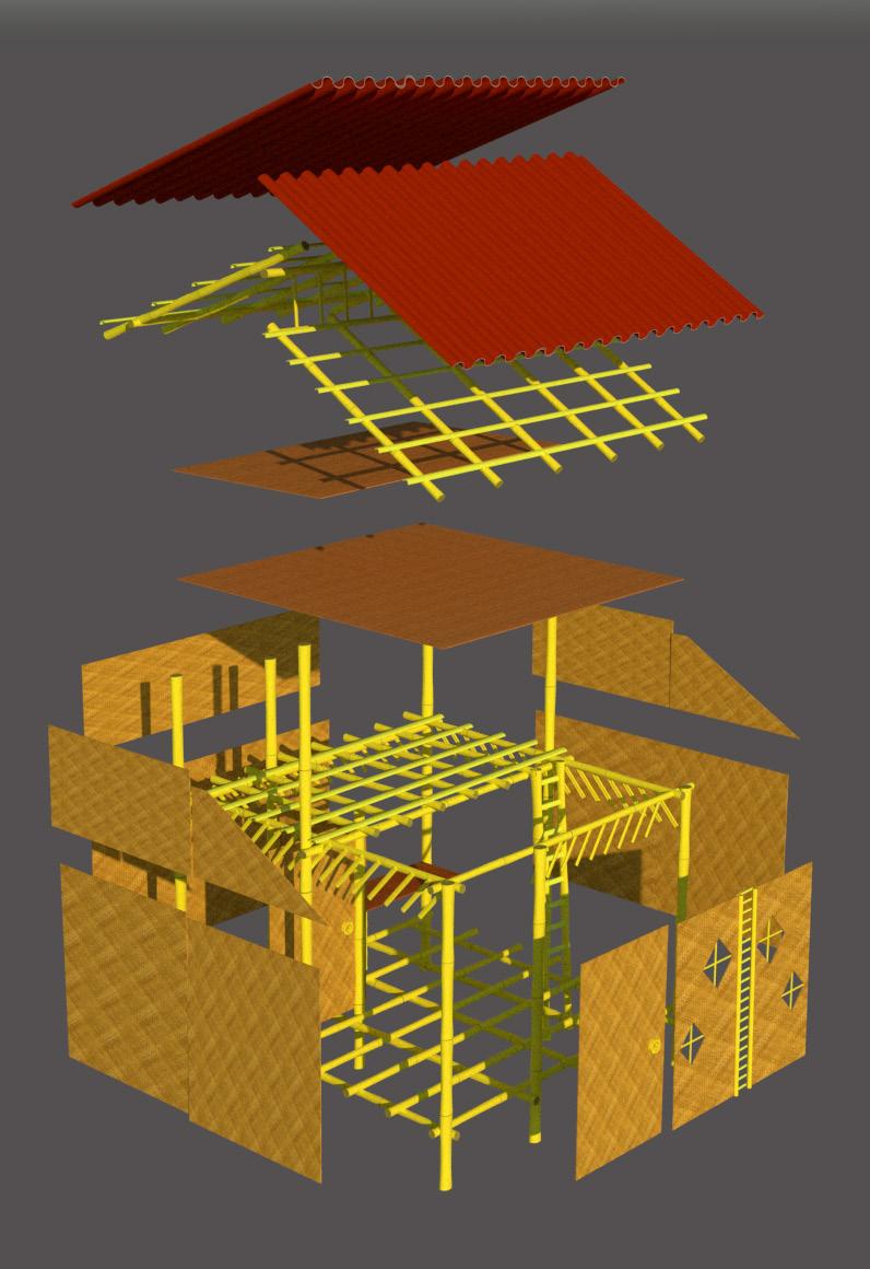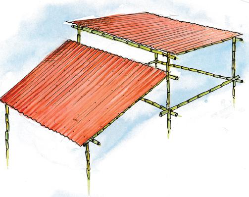 Corrugated roofing sheet is placed over the bamboo frame with 15cm overlap and fitted tightly with screws.