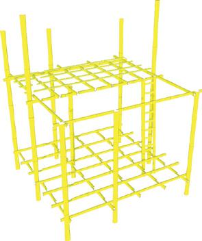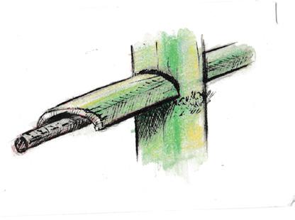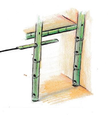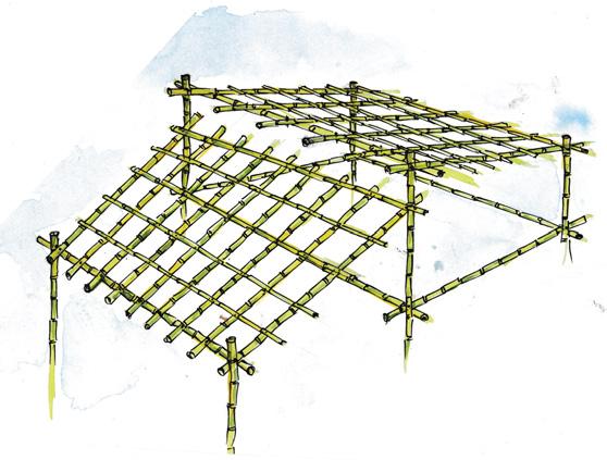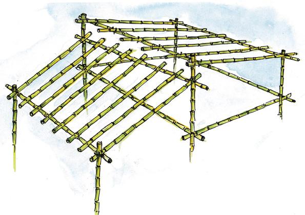 Holes are made in the bamboo supports and bamboo stripsare placed in it along with reinforcing bar.