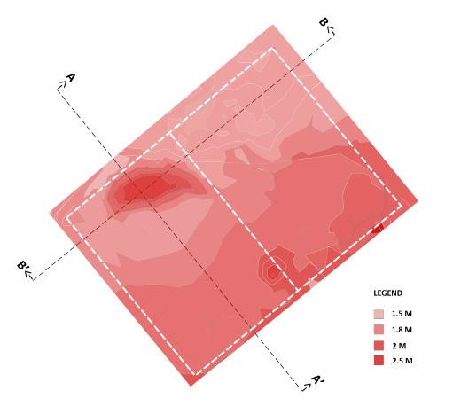 Elevation mapping has been done as shown in the illustrations below to understand the topography of the site. Each contour interval is assigned a shade, the darker shade signifies the highest level and as we go down, the shade intensity reduces. By plotting the elevation map of the site, it becomes clear that the site has a very undulating terrain with a significant drop in all four directions. The maximum level difference between the lowest and highest contour in the proposed site is 1m.