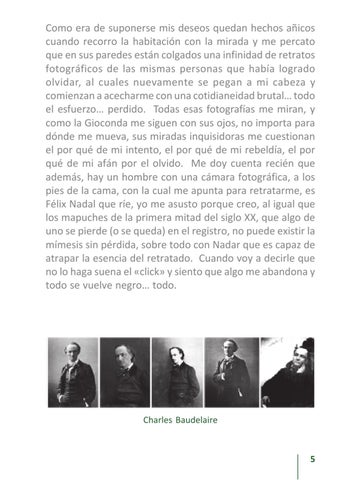 Como era de suponerse mis deseos quedan hechos añicos cuando recorro la habitación con la mirada y me percato que en sus paredes están colgados una infinidad de retratos fotográficos de las mismas personas que había logrado olvidar, al cuales nuevamente se pegan a mi cabeza y comienzan a acecharme con una cotidianeidad brutal… todo el esfuerzo… perdido. Todas esas fotografías me miran, y como la Gioconda me siguen con sus ojos, no importa para dónde me mueva, sus miradas inquisidoras me cuestionan el por qué de mi intento, el por qué de mi rebeldía, el por qué de mi afán por el olvido. Me doy cuenta recién que además, hay un hombre con una cámara fotográfica, a los pies de la cama, con la cual me apunta para retratarme, es Félix Nadal que ríe, yo me asusto porque creo, al igual que los mapuches de la primera mitad del siglo XX, que algo de uno se pierde (o se queda) en el registro, no puede existir la mímesis sin pérdida, sobre todo con Nadar que es capaz de atrapar la esencia del retratado. Cuando voy a decirle que no lo haga suena el «click» y siento que algo me abandona y todo se vuelve negro… todo.