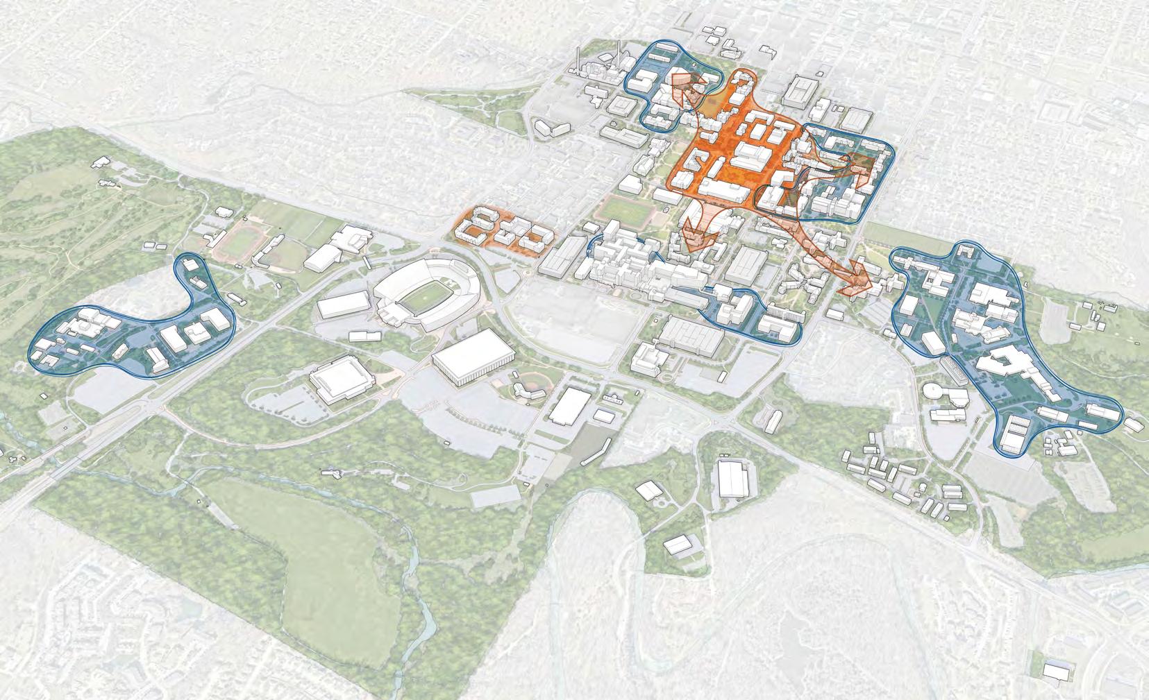 Research and instructional space will continue to overlap. This plan identifies a core area to locate instructional spaces that are used by a larger percentage of the student population, such as centrally scheduled classrooms and introductory labs, in the center of campus. Similarly clustering research allows for redundancy and greater infrastructure support.