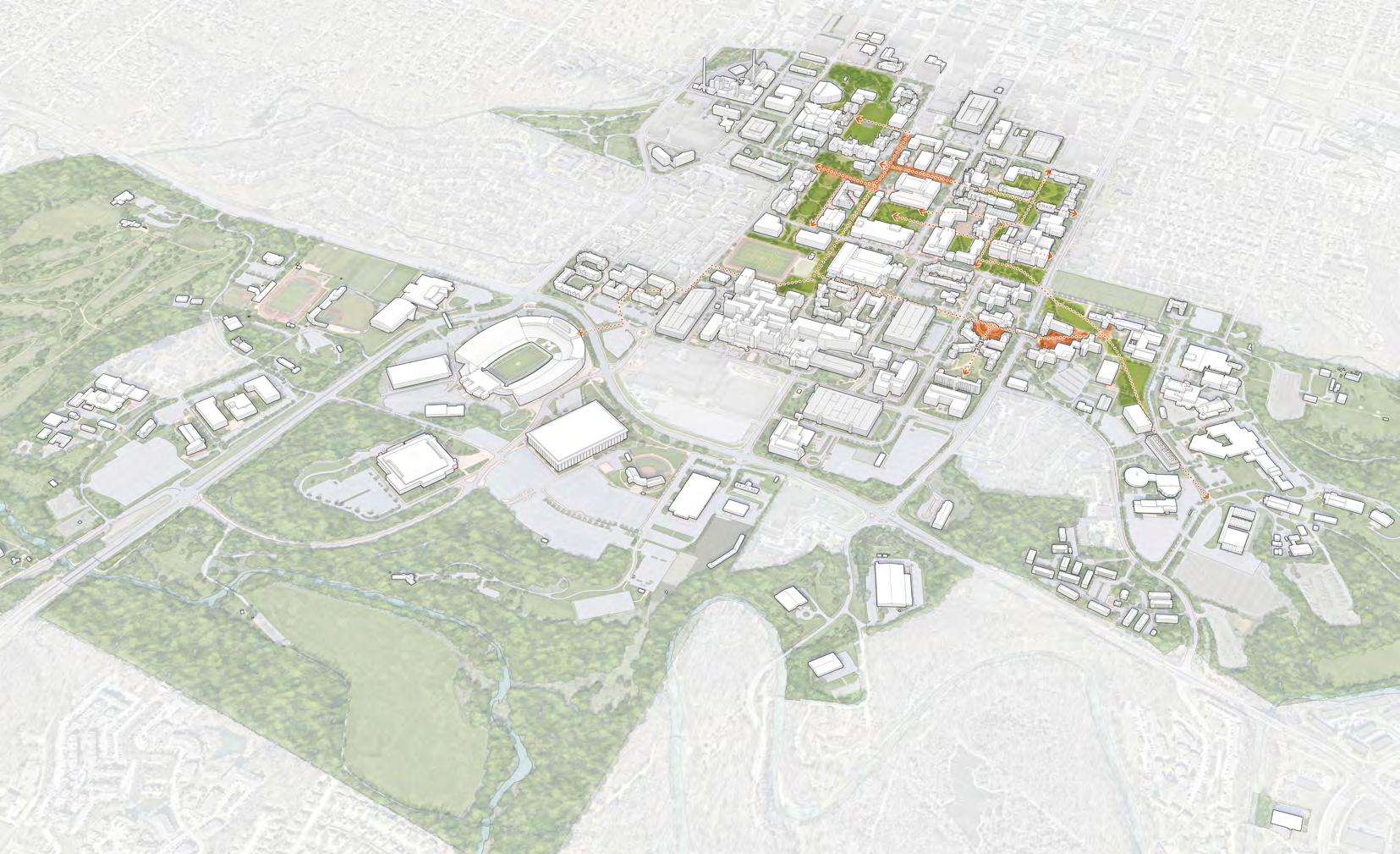 The design and utilization of the exterior campus environment plays an important role in first impressions, health and wellness, instruction and research, sustainability, and connectivity. The Master Plan strives to create greater clarity and consistency between all areas of campus and to the City through a cohesive network of landscapes.