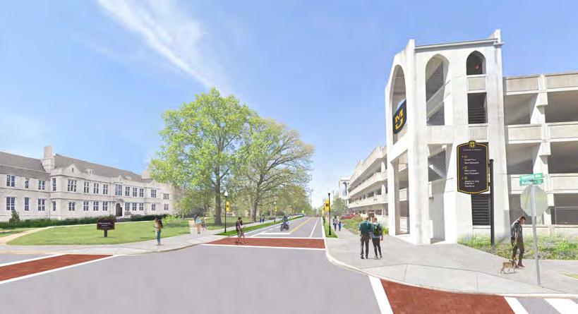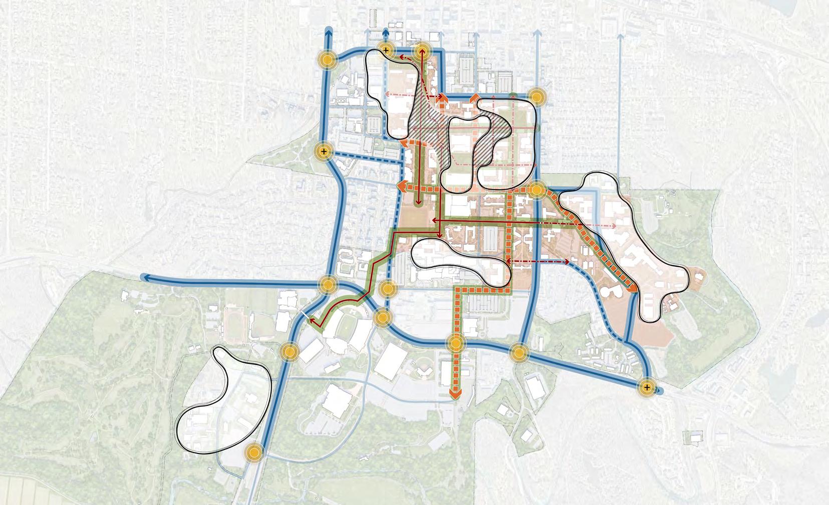 The Master Plan provides opportunities to clarify circulation among cars, buses, bikes, scooters, and pedestrians to provide a safer and more enjoyable campus experience. These opportunities also leverage parking resources at the edges of campus and better connect the campus to existing mobility infrastructure in the City of Columbia. Specific opportunities include: