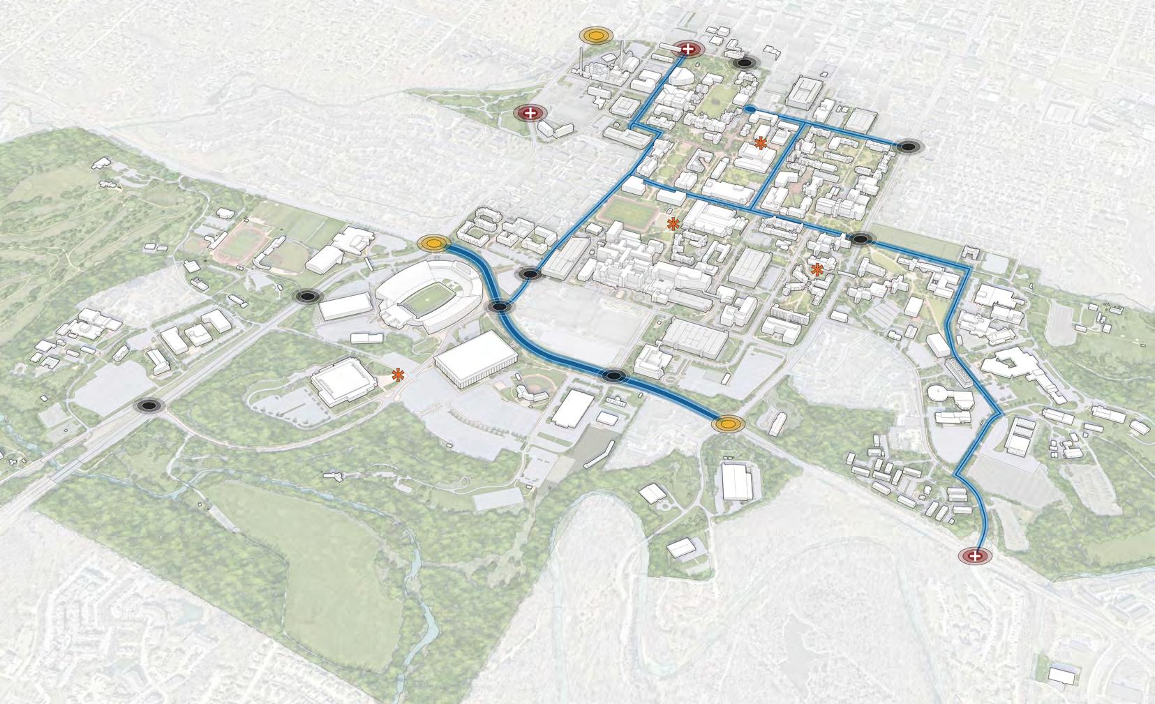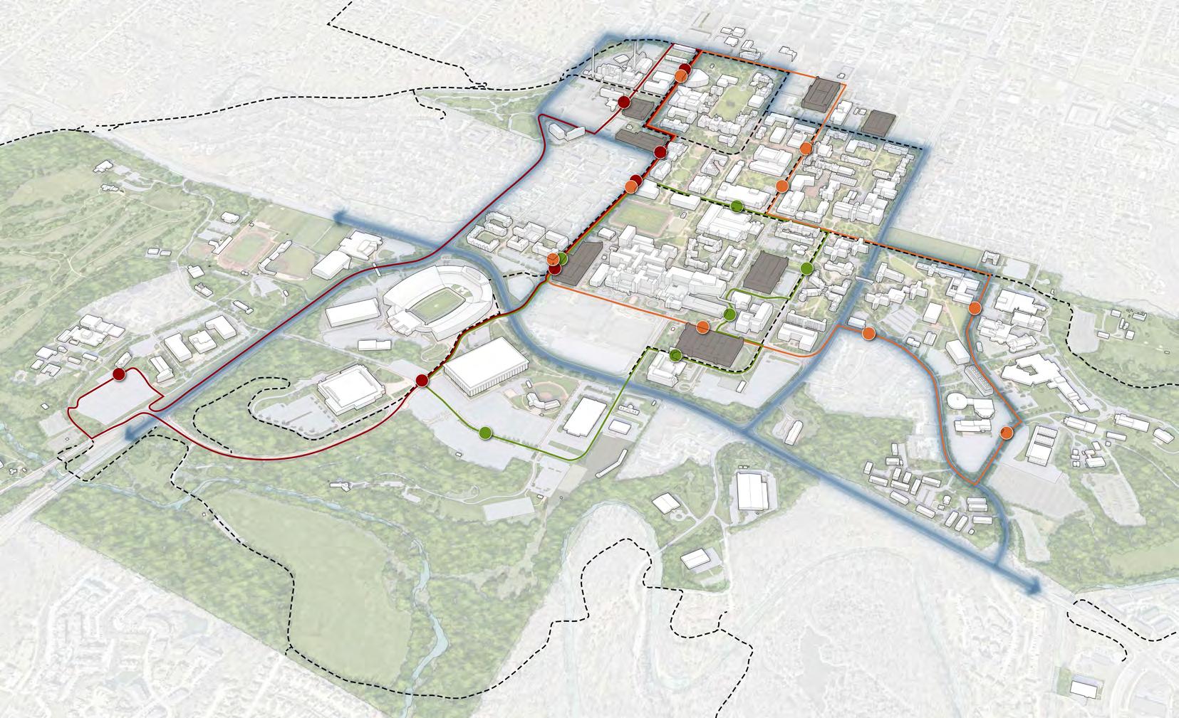 Compact campus footprint, bike and scooter infrastructure, enhanced bus network, connected pathways and trails