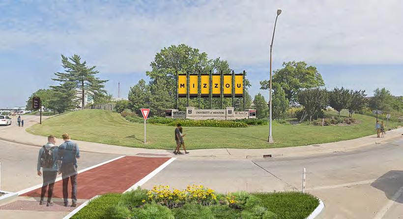Opportunities to celebrate and showcase the Mizzou brand are identified through gateway locations, streetscape enhancements, and a new signage kit of parts. New gateway locations are proposed at 6th Street and Elm Street, Stadium Boulevard and Ashland Road, and Providence Road and Turner Avenue. Enhancements at these locations provide clarity to the edges of campus for first-time visitors and people going to the Veterinary Health Center and College of Agriculture facilities. There are also opportunities for several existing gateways to be enhanced to reflect the scale of their location and visibility from the road. These include Stadium Boulevard and College Avenue, Stadium Boulevard and Providence Road, and Providence Road and Elm Street.