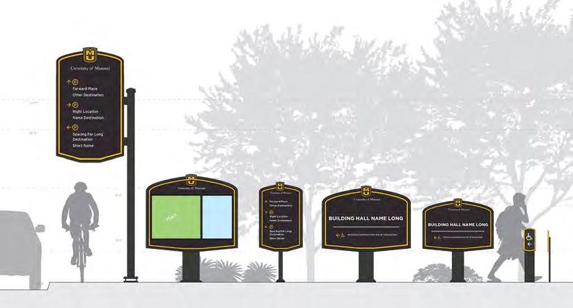 To improve the identity and connectivity on campus, a complete kit of parts wayfinding system has been proposed. The sign designs reflect Mizzou’s brand in a distinctive manner and includes wayfinding from “highway to hallway.” The City of Columbia is concurrently developing a new wayfinding program, which provides the opportunity for coordination prior to implementation. Locations for capturing the Mizzou spirit are also identified for branding and photo elements coordinated with the landscape.
