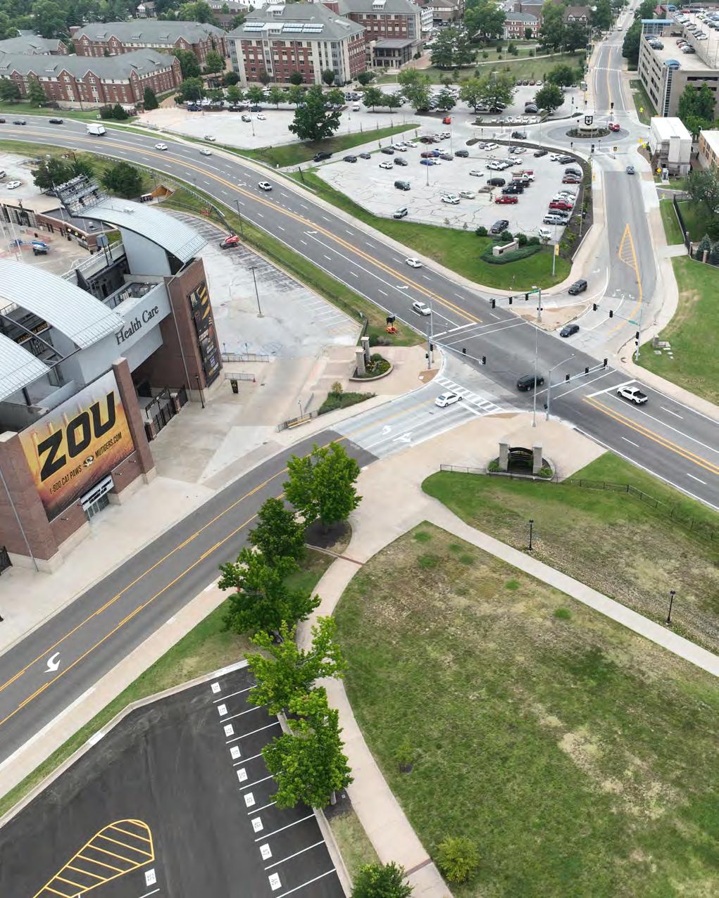 Mizzou has grown over time within the structure of the City of Columbia. The campus assessment identified areas where existing roads and intersections experience higher volumes of accidents and conflicts while existing methods to limit vehicular access through heavily-pedestrian areas of campus during the day lack consistent enforcement. Additionally, more convenient bus routes and stop locations could support a more holistic campus mobility system.