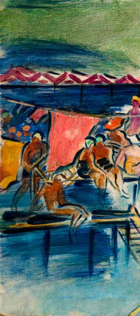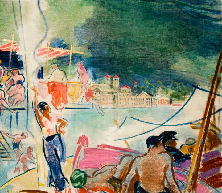 As the Roman School gained currency in Hungarian painting as a trend in the vein of the classical tradition, even artists who subscribed to the more modern, French idiom of painting were likewise not left untouched by everything that Italy meant. János Vaszary was a case in point. A respectable academy professor, the nephew of Archbishop Kolos Vaszary and a former war painter, he was also curious about modern life. With pure colours applied with an economy of virtuosic brushstrokes, his canvases bustle with parasols, bathrobes, sails, the striped shirts of sailors, palm trees and cocktails with straws. Nor will his seaside scenes ever go out of fashion: the healthy tans, bathing suits and parasols look much the same today as they did one hundred years ago.