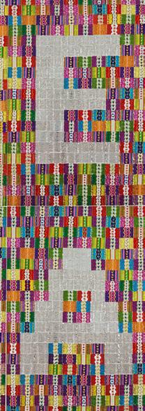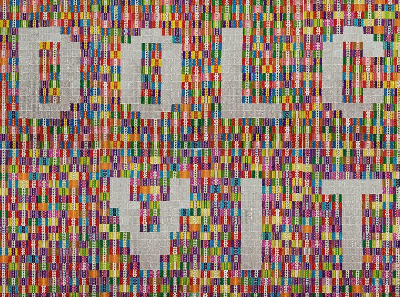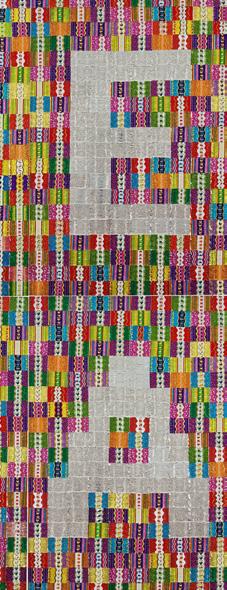 exhibition. The work, sized 300 × 180 cm, is composed of shiny, colourful sweet wrappers; some, however, face the viewer with their uninteresting, plain insides, making up the inscription, Dolce Vita