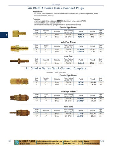 Air Chief A Series Quick-Connect Plugs Application: • for use in compressed air service where the convenience of one hand operation and a compact profile is desired Features: • maximum operating pressure: 500 PSI at ambient temperature (70°F) • machined from solid brass bar stock • stainless steel balls and springs maximize corrosion resistance