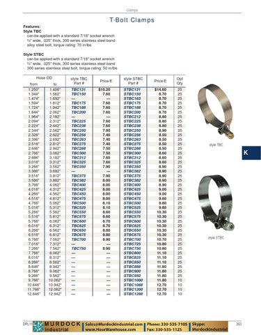 T-Bolt Clamps Features: Style TBC • can be applied with a standard 7/16" socket wrench • ¾" wide, .025" thick, 300 series stainless steel band • alloy steel bolt, torque rating: 70 in/lbs Style STBC • can be applied with a standard 7/16" socket wrench • ¾" wide, .025" thick, 300 series stainless steel band • 300 series stainless steel bolt, torque rating: 50 in/lbs Hose OD from 1.250" 1.344" 1.474" 1.594" 1.724" 1.844" 1.964" 2.094" 2.224" 2.344" 2.326" 2.396" 2.516" 2.646" 2.766" 2.886" 3.016" 3.266" 3.386" 3.516" 3.586" 3.766" 4.016" 4.266" 4.516" 4.766" 5.016" 5.266" 5.516" 5.766" 6.016" 6.266" 6.516" 6.766" 7.016" 7.266" 7.766" 8.016" 8.266" 8.646" 8.766" 9.266" 9.766" 10.646" 11.766" 12.646"