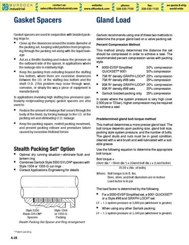 Percent Compression Method This method simply determines the distance the set should be compressed in order to achieve a seal. The recommended percent compression varies with packing style. 9000-EVSP Simplified 30% compression QUICKSET® 9001 30% compression ■ 3 ® 70# / ft density GRAPH-LOCK 25% compression 70# / ft3 density #98 sets 25% compression ■ 3 ® 90# / ft density GRAPH-LOCK 20% compression 90# / ft3 density #98 sets 20% compression ■ Garlock braided packing only 25% compression ■