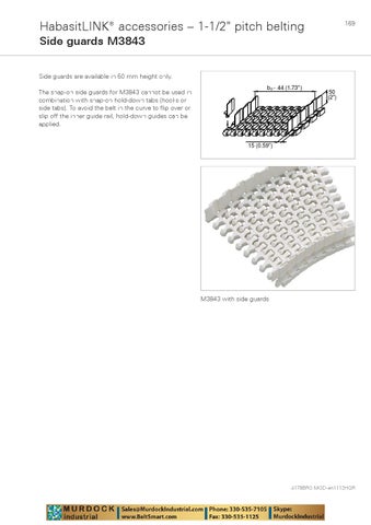HabasitLINKŽ accessories – 1-1/2" pitch belting Side guards M3843 Side guards are available in 50 mm height only. The snap-on side guards for M3843 cannot be used in combination with snap-on hold-down tabs (hooks or side tabs). To avoid the belt in the curve to flip over or slip off the inner guide rail, hold-down guides can be applied.