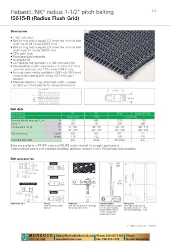 IS615-R (Radius Flush Grid) Description • 1-1/2 inch pitch • Belt turning radius equals 2.2 times the nominal belt width up to 24 inches (609.6 mm) • Belt turning radius equals 2.5 times the nominal belt width over 24 inches (609.6 mm) • 75% open area • Food approved materials • Bi-directional • Connecting rod diameter = 0.188 inch (4.8 mm) • Standard belt width increments = 3 inch (76.2 mm) nominal, starting from 7.25 inches (184.2 mm) • Non-standard widths available in 5/8 inch (15.9 mm) increments starting at 5 inches (127 mm) upon request • Material selection may affect belt width – please contact your local partner for actual dimensions