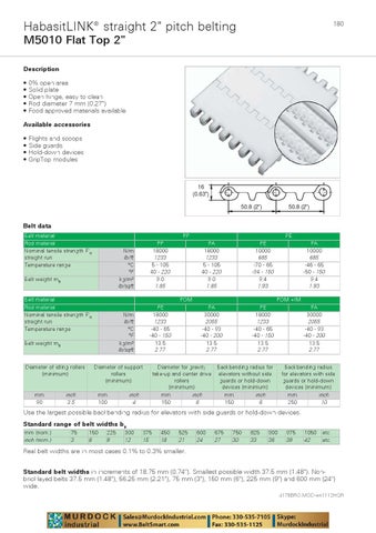 Real belt widths are in most cases 0.1% to 0.3% smaller. Standard belt widths in increments of 18.75 mm (0.74"). Smallest possible width 37.5 mm (1.48"). Nonbricklayed belts 37.5 mm (1.48"), 56.25 mm (2.21"), 75 mm (3"), 150 mm (6"), 225 mm (9") and 600 mm (24") wide. 4178BRO.MOD-en1112HQR